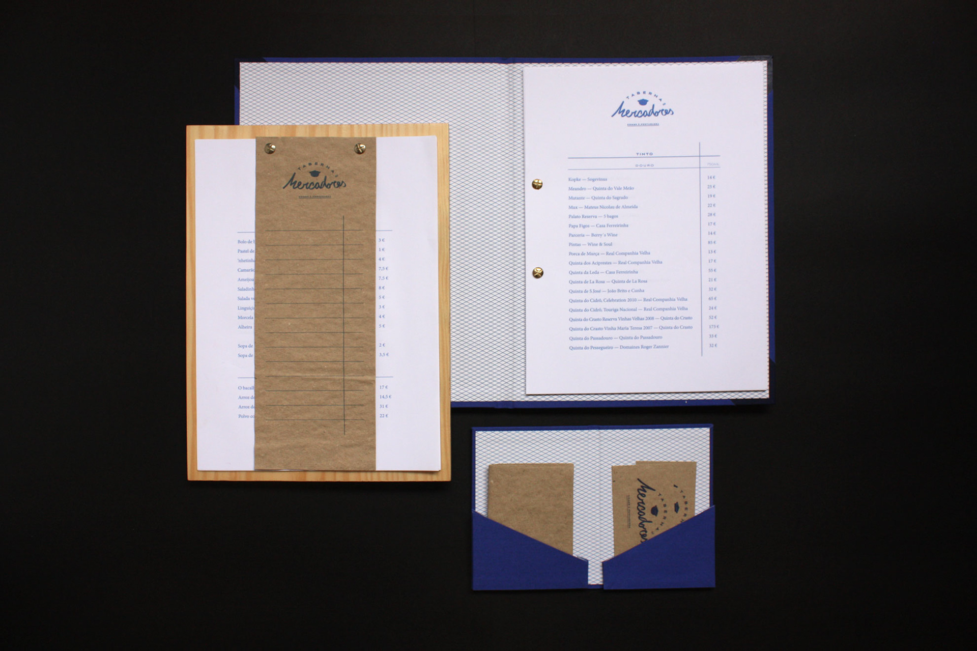 The basis for this identity were the pine wood and the chinaware, giving us the main material and the color. The script text, the brown paper and the information display on the menu are all elements that were inspired by the portuguese tavern tradition.